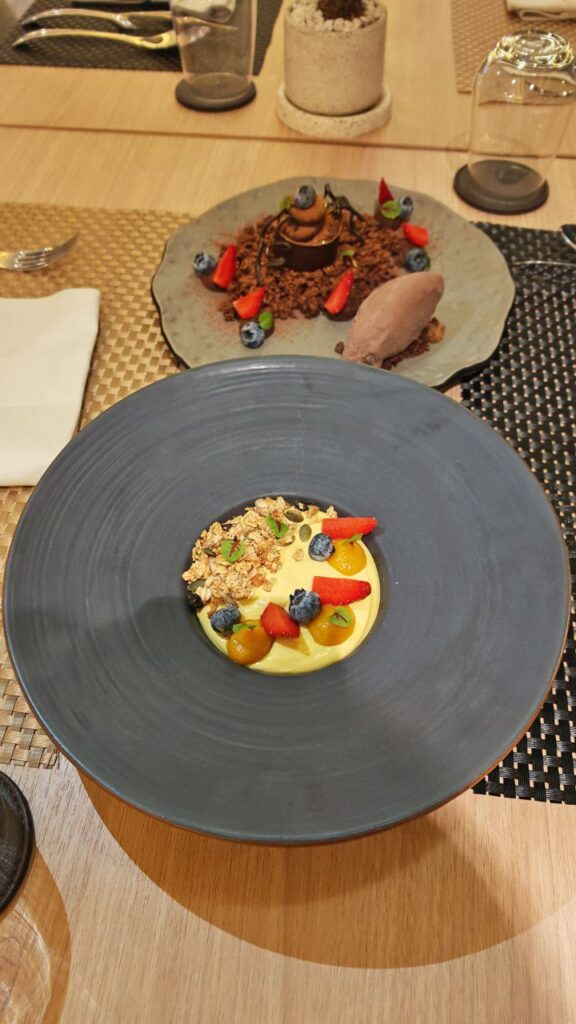 To conclude, dessert arrived as a delightful duo: the Mango Cheesecake and Forest Dark Chocolate Mousse. The mango cheesecake was light and tropical, striking a pleasant balance between sweetness and freshness, while the dark chocolate mousse offered a deeper, indulgent finish—silky, intense, and satisfying without being overwhelming.