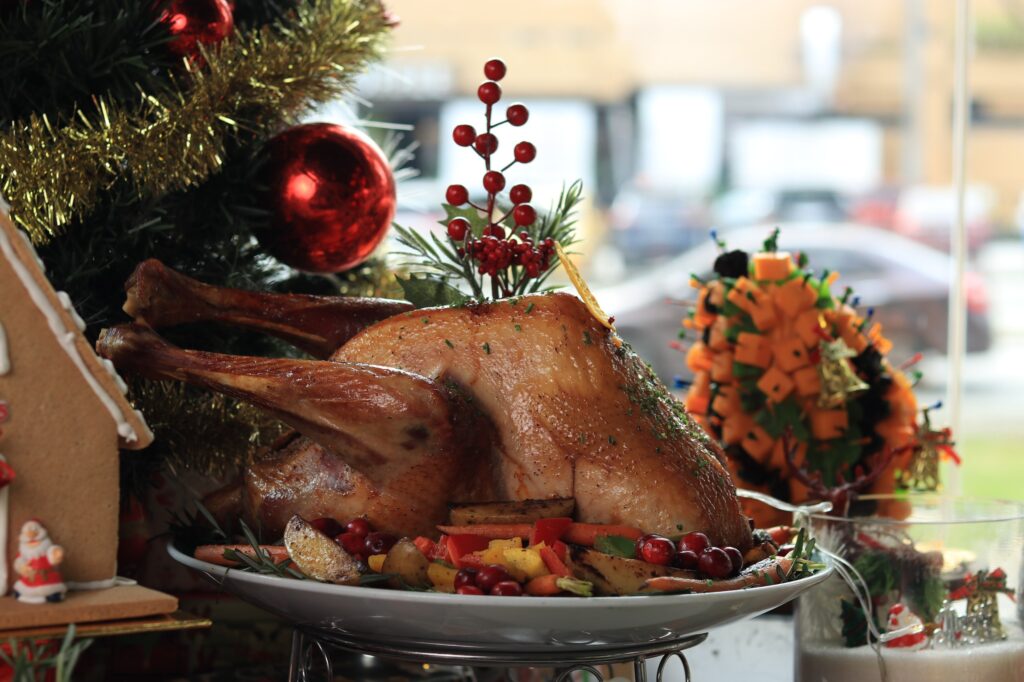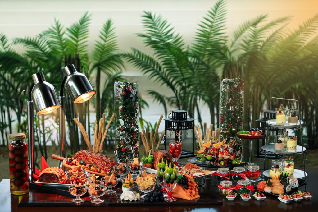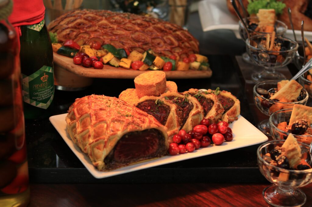 Continue the celebration with a festive hi-tea filled with hearty Christmas favourites such as Baked Whole Seabass, Pink Peppercorn Gravy, Yorkshire Pudding, Whole Chicken with Mushroom, and an abundant spread of appetizers, mains, and desserts — all accompanied by live festive tunes from the hotel’s Batak Band.