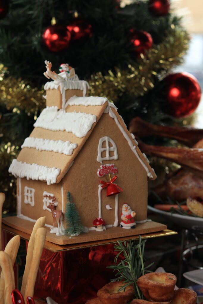 • A whimsical dessert selection including a Chocolate Mountain Choux Puff Tower, Gingerbread House, Fruit Cake & more