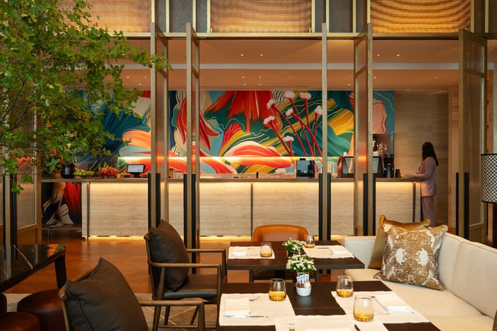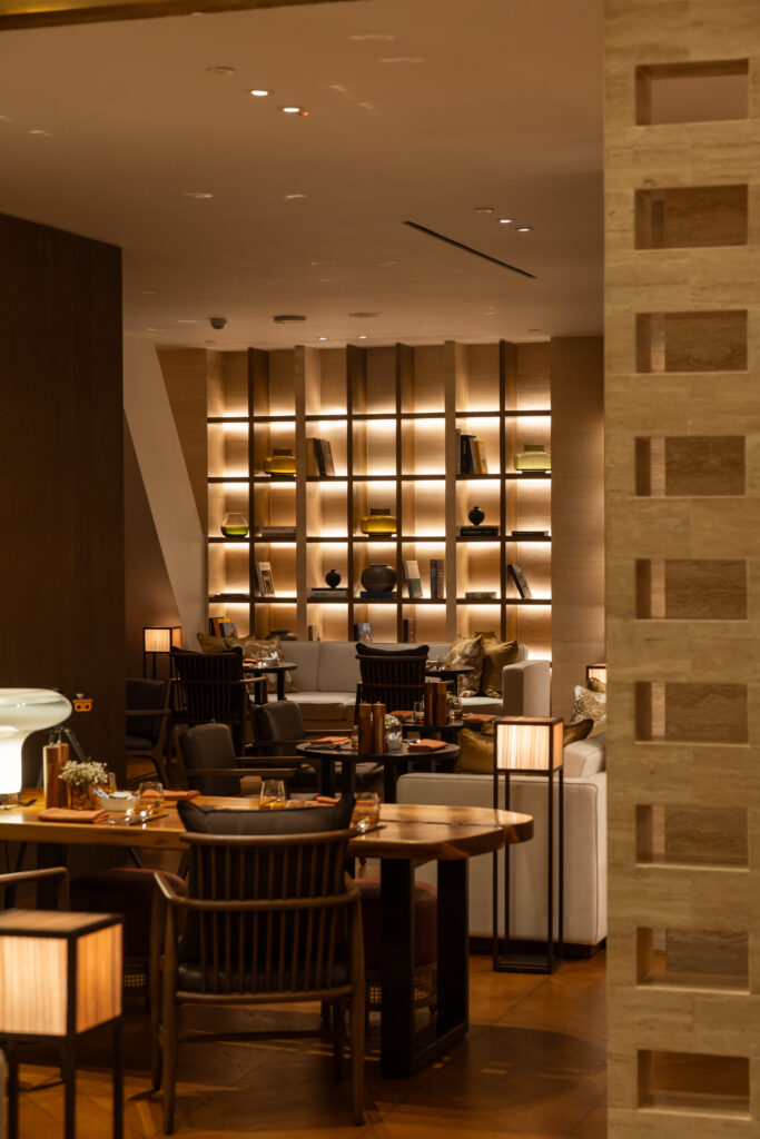 On the same floor, guests can choose from three distinct dining venues that are cohesively connected through an open, fluid layout. The Park Lounge is a bright, open space that sits with all dining areas enjoying viewing into the lively open Kitchen, serving as a focal point that’s decorated with Peranakan-inspired red tiles. This seamlessly flows into the Lounge area – designed to be a warm, inviting space that utilises soft light to create a sense of comfort and intimacy.